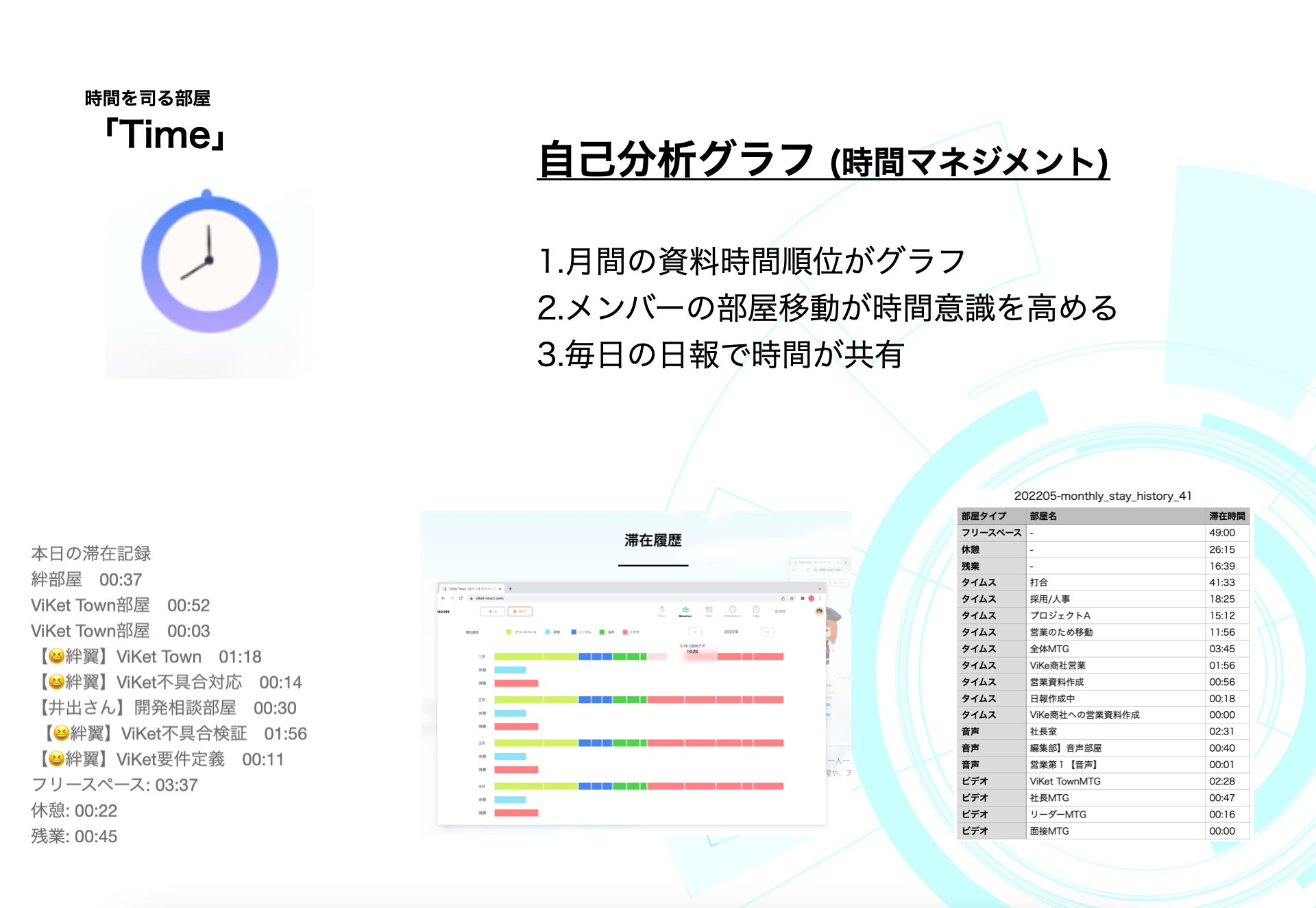 Time部屋の活用により時間が計測されるため、プロジェクトの使用時間を計測できます。また、入室時に期限を設定できるため、想定時間に対して、消費した時間管理することが自己分析に繋げます。また、PC以外の接客をしている時等、移動中接客中、作業中等、伝えたい状況の名前で部屋をつくり、部屋に入る事異世界空間にいる仲間に自分の状況を伝えることも可能に。