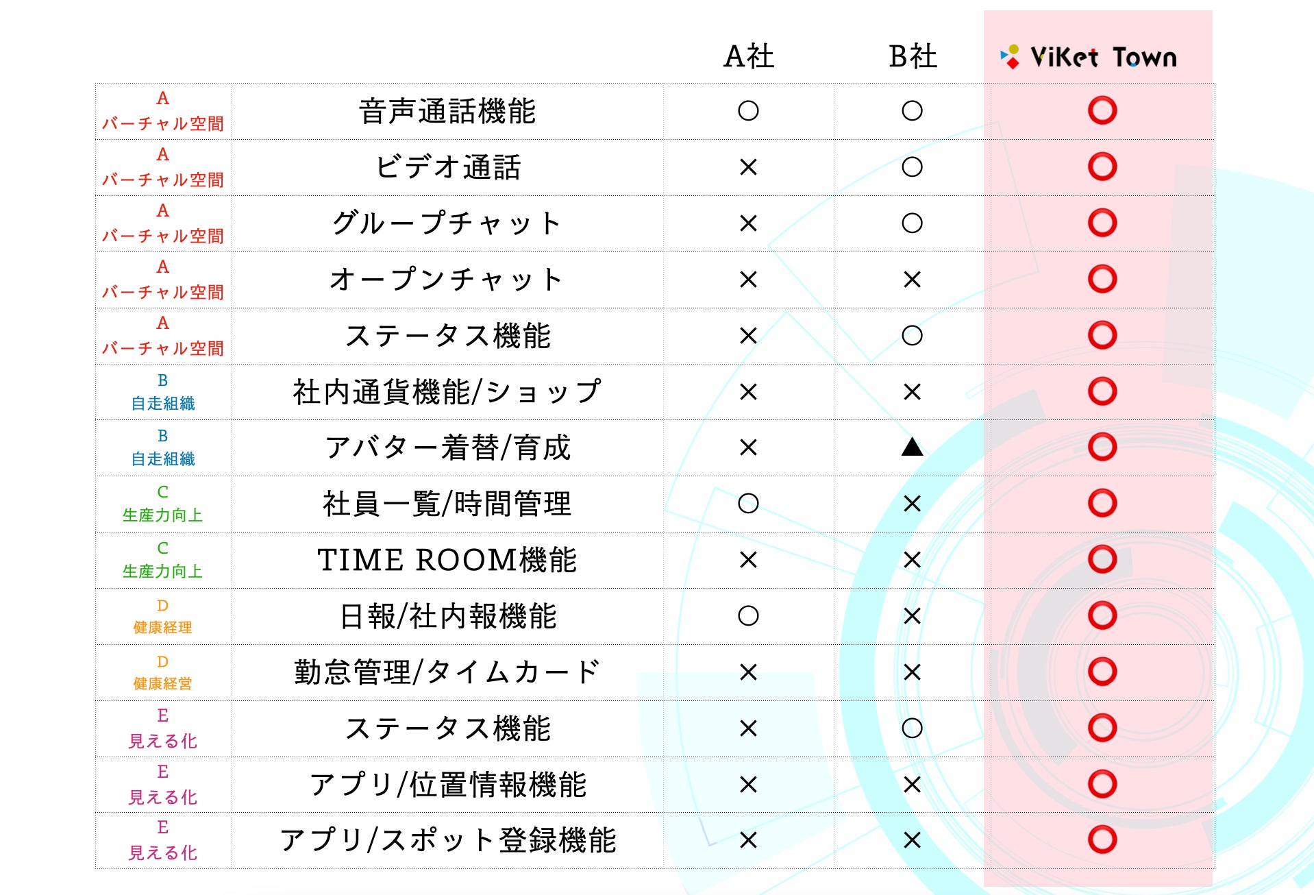 | (A)バーチャル空間 リモートワークおけるすべてのコミュニケーションツール(連絡手段)がある (ビデオ通話/音声通話/グループチャット/オープンチャット) (B)自走組織 アバターと社内通貨(vike)で自発的にコミュニケーションがおき、 自走するモチベーションが高い組織をつくれる (C)生産力向上 業務時間分析ができることで、社員の自発的な自己成長を促し、上司による適切なアドバイスが可能に (D)健康経営 勤怠管理、社内報、日報、TODO管理、残業管理、休憩や残業アラート (E)見える化 ステータス機能、アプリの位置情報、スポット登録 |