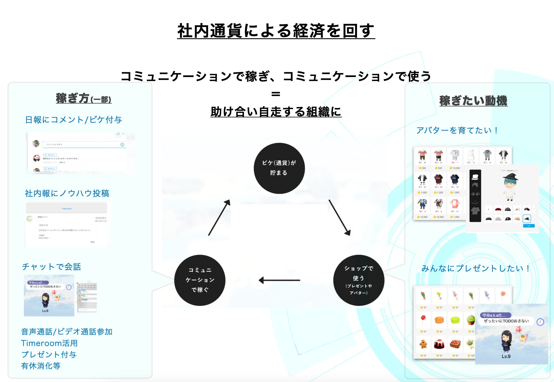 アバターと社内通貨(vike)で自発的にコミュニケーションがおき、 自走するモチベーションが高い組織をつくれます。日報へのコメントやチャットへの会話などのコミュニケーションでvikeを稼ぎ、アバターショップにて、服装、装飾、新アイテムと交換することができます。アイテムは、仲間同士でも交換する事ができる為、「ありがとう」の言葉と共に感謝の気持ちを送る事で、 仲間同士で助け合いを促進し、仲間同士で自走するティール型組織の醸成が可能になります。 また、今回新たにリリースしたフリーマーケット機能で仮想通貨の価値を高めていくことができます。