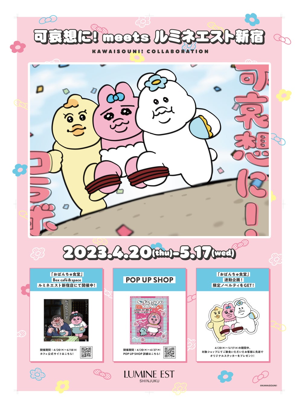 「おぱんちゅうさぎ」「んぽちゃむ」などのキャラクターを手がけるイラストレーター・可哀想に!と、ルミネエスト新宿による期間限定コラボを実施いたします。期間中は「おぱんちゅうさぎ」のコラボカフェ「おぱんちゅ食堂」やポップアップショップ「おぱんちゅうさぎPOP UP」の開催に加え、対象店舗での限定ノベルティステッカーの配布や、ルミネエスト新宿のために書きおこしたオリジナルキービジュアルによる館内装飾、8F PARKでのパネル展示と動画放映も行います。