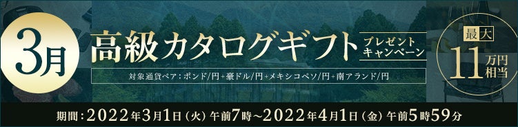 本キャンペーンでは、キャンペーン期間中の外国為替保証金取引(FX)『選べる外貨』における、ポンド/円、豪ドル/円、メキシコペソ/円、南アランド/円の新規取引数量合計と取引口座残高に応じて、最大110,000円相当の高級カタログギフト(『リンベル ザ・プレミアム』)をプレゼントいたします。キャンペーンにお申し込みいただき、取引条件を満たしたお客様全員がプレゼントの対象となりますので、ぜひこの機会に『選べる外貨』でのお取引をご検討ください。