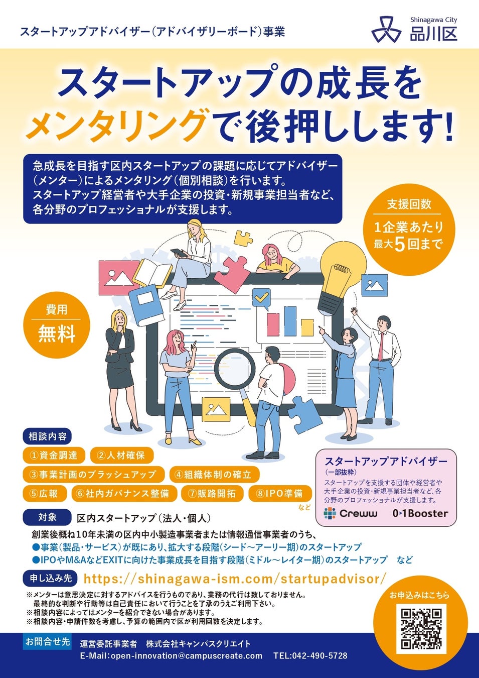 品川区では、大手企業の投資担当者や新規事業担当者がメンターとなり、スタートアップの課題解決を支援する「スタートアップアドバイザー事業」を実施しています。