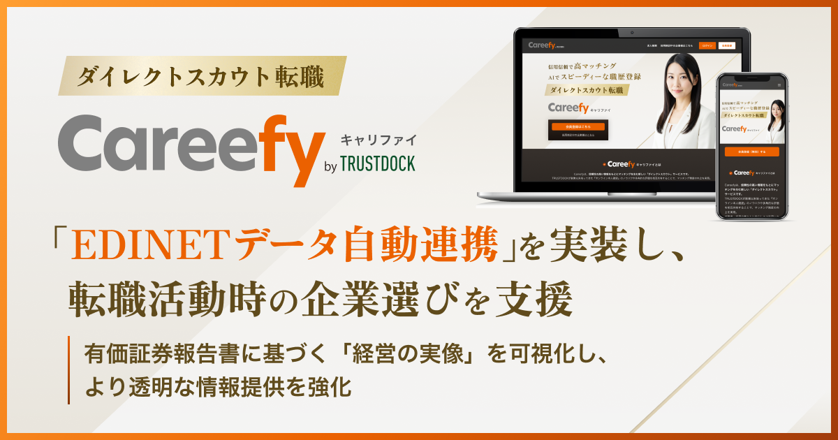 株式会社TRUSTDOCK (東京都中央区、代表取締役:千葉 孝浩) が展開する、ダイレクトスカウトサービス「Careefy」(キャリファイ) は、転職サービス初 (※)となる、金融庁の電子開示システム「EDINET」とのデータ自動連携機能をリリースしました。