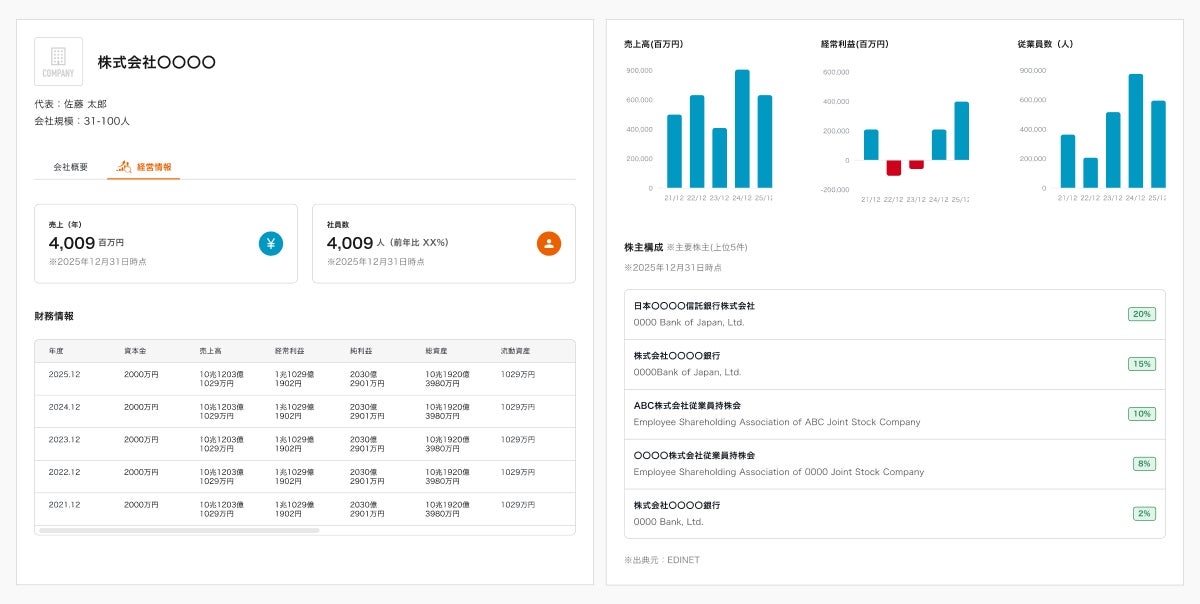 本機能は、EDINETによる上場企業の公的データをもとに、売上、社員数、株主構成などの経営情報を企業ページに自動表示するものです。これにより求職者は、口コミや求人情報だけでは分かりにくい企業の実態を、透明性の高いデータに基づいて確認できるようになります。なお、本機能は会員登録をされた方に無料でご利用いただけます。