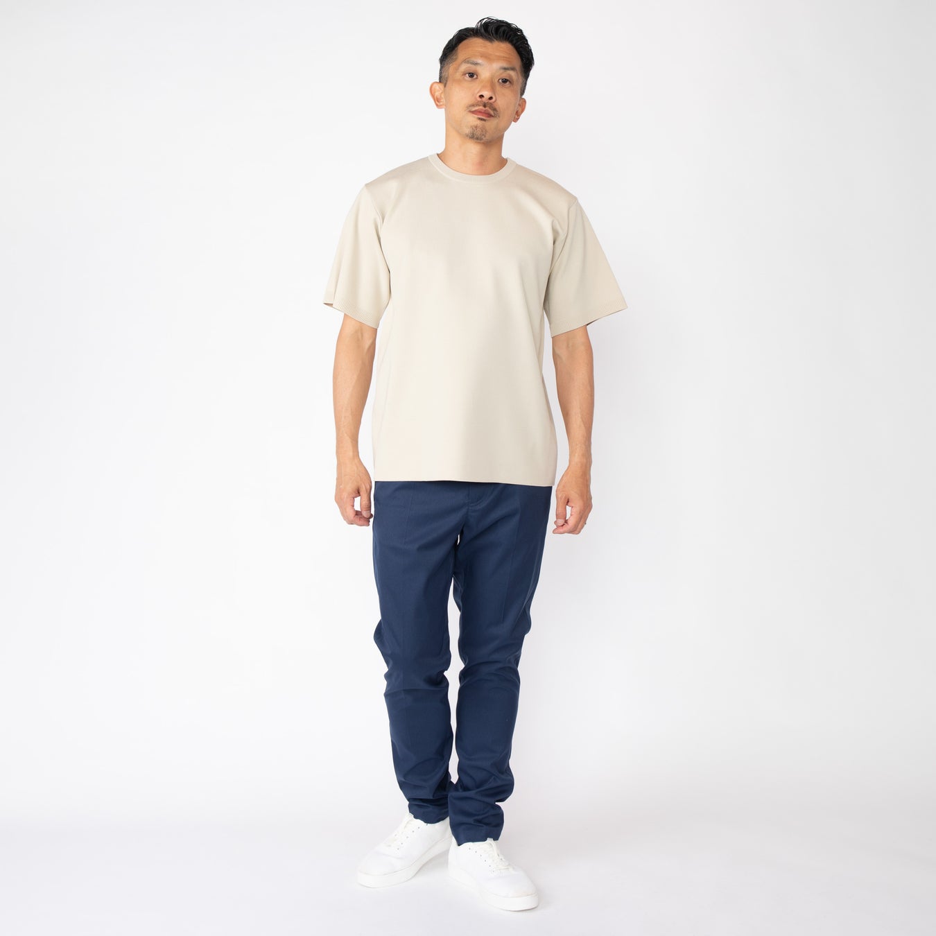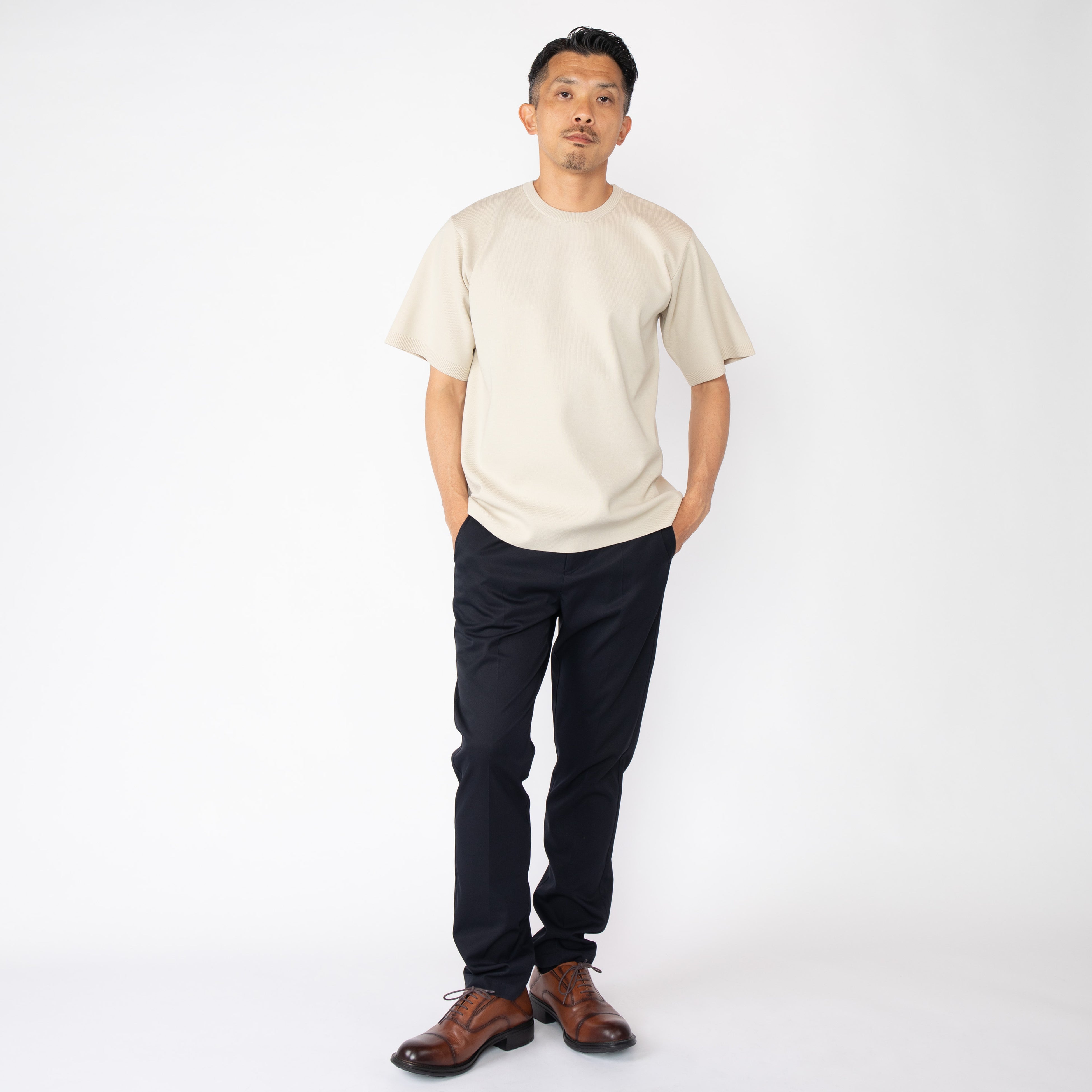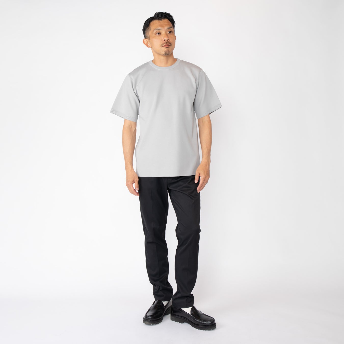 こだわりの製法と素材で、着ているうちに起こるニット特有のヨレや型崩れを軽減。また、表面に抗ピリング加工を施すことで毛玉ができにくく、Tシャツのように扱えます。
