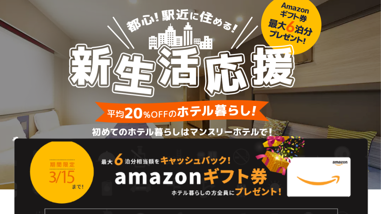メトロエンジン株式会社(本社:東京都港区、代表取締役CEO:田中良介、以下メトロエンジン)と、BEENOS株式会社(東証一部:3328)の連結子会社で、日本の魅力を世界に拡げ、インバウンド市場成長の加速を支援するBEENOS Travel(ビーノス トラベル)株式会社(代表取締役社長:竹内 拓、以下BEENOS Travel)が運営する、7泊以上の長期予約がリーズナブルな長期滞在専門予約サイト「Monthly Hotel(マンスリーホテル、URL:https://monthlyhotel.jp/)」は、2022年3月1日(火)~3月15日(火)中に予約を30泊以上し、宿泊された方を対象に最大6泊分のAmazonギフト券をプレゼントするキャンペーンを実施いたします。