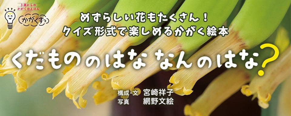 【新刊情報】かがくの目でみると、おどろきと発見が!かがくすっシリーズ『くだもののはな なんのはな?』(宮崎祥子・構成・文/網野 文絵・写真)発売!クイズ形式で楽しめる3歳からのかがく絵本。