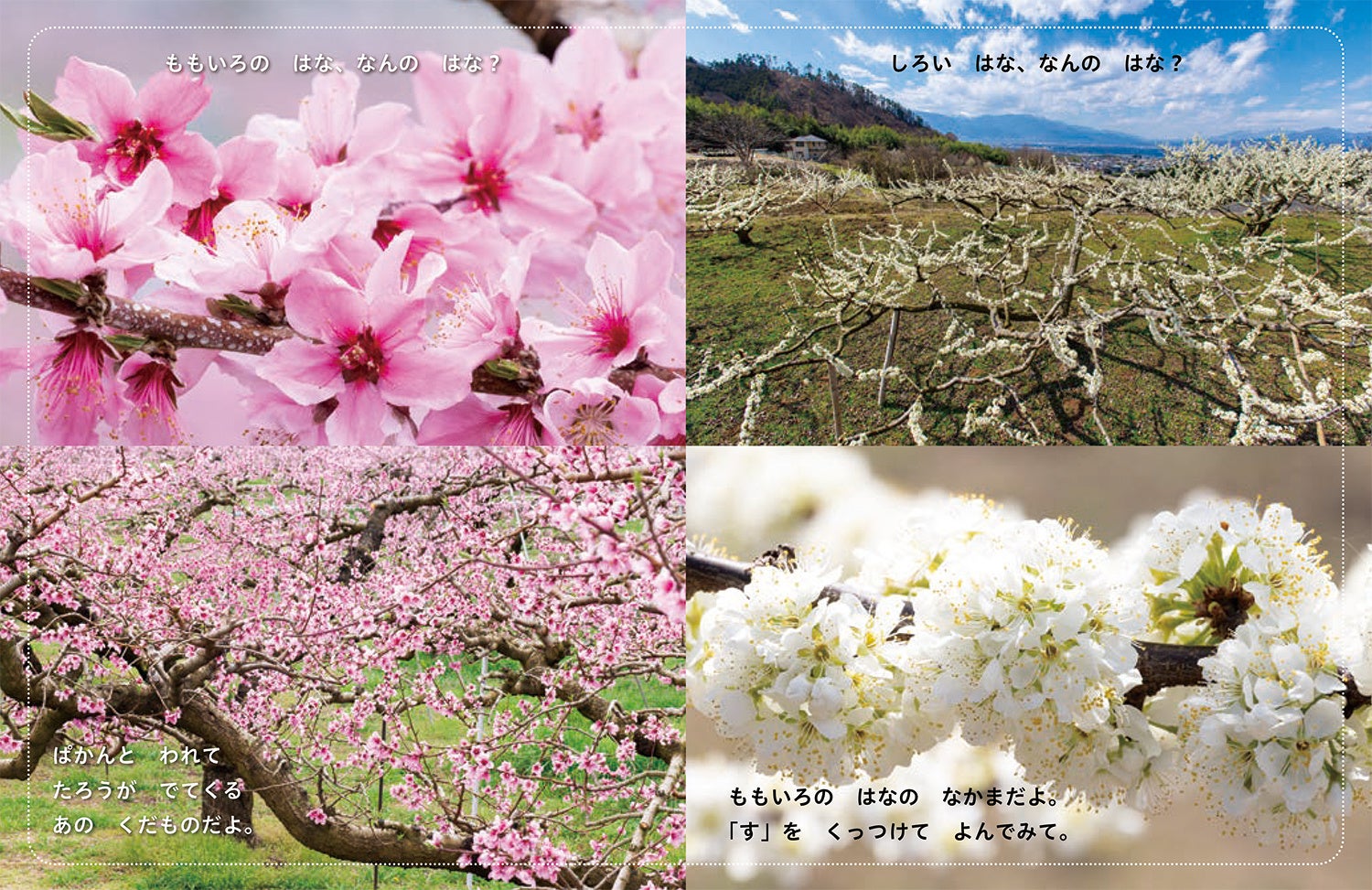 お花の形から、なんのくだもの花なのか? を推測するのがむずかしいですが、たのしいテキストがヒントになっているので、クイズ形式で、楽しみながら、学ぶことができます。