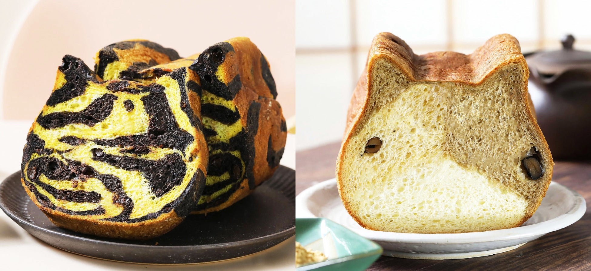 パンプキン風味の生地とブラックココア生地を使って再現した「ねこねこ食パン とら」。