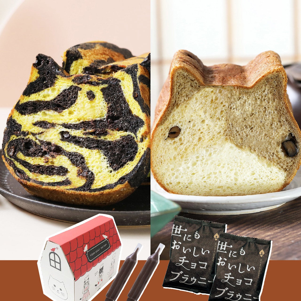 ・内容:ねこねこ食パン とら1個、ねこねこ食パンきなこもち1個、チョコペン2本、世にもおいしいチョコブラウニー2個、手提げ袋2枚、ねこねこハウスBOX(小)1枚