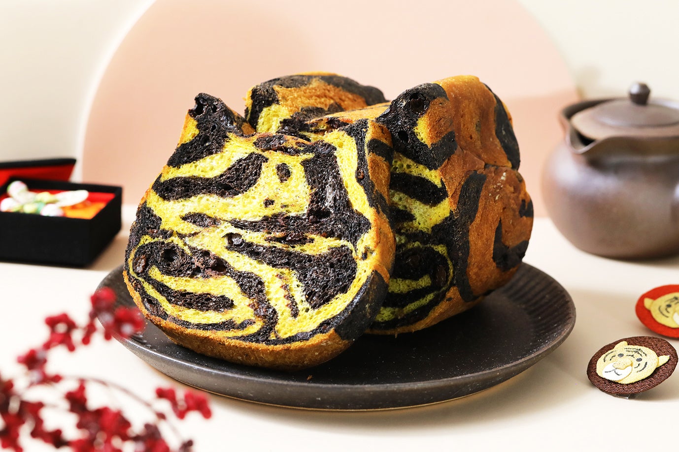 また、チョコチップとラム酒漬けレーズンを練り込んでいるため、見た目だけでなく食感もお楽しみいただけます。1月にぴったりな「ねこねこ食パン とら」をぜひご賞味ください。