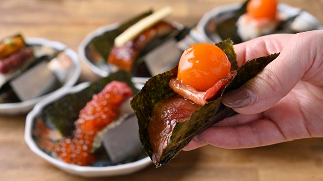 ふんわりした酢飯に、鰻・和牛・海鮮をたっぷりのせて海苔でやさしく包み込みました。片手で手軽に楽しめるのに、味わいは本格派。ヘルシーでフォトジェニックな“持ち歩ける寿司”として人気上昇中です。