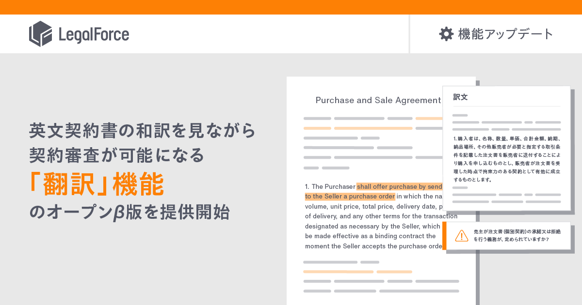 AI契約審査プラットフォーム「LegalForce」、英文契約書の和訳を見ながら契約審査が可能になる「翻訳」機能のオープンβ版を提供開始