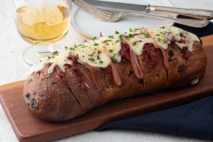 洋酒に漬け込んだ甘くジューシーなカリフォルニア産のレーズンと、酸味の強いトルコ産のレーズンの2種類のレーズンを練り込むことでバランスの良い味わいに仕上げました。石窯オーブンで焼成することで外側のクラストはパリッと香ばしく、内側のクラムはふっくら、しっとりとした食感をお楽しみいただけます。