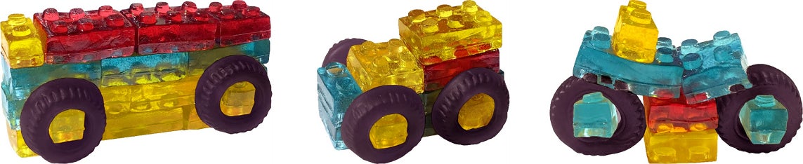 特徴 :車を組み立てて学びながら食べられるブロック型とタイヤ型の立体グミ