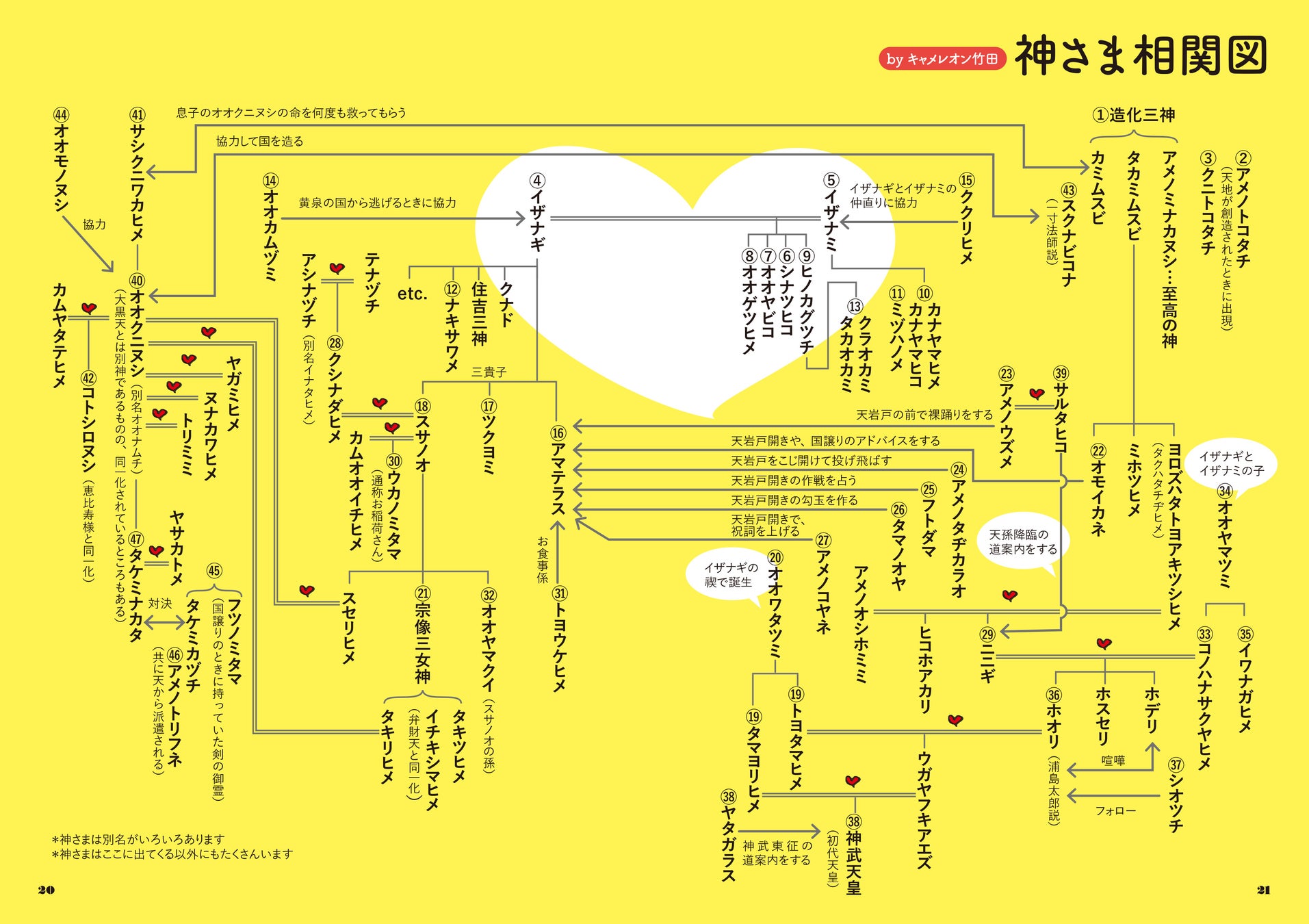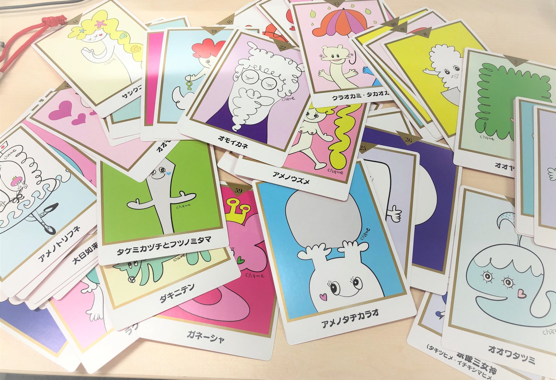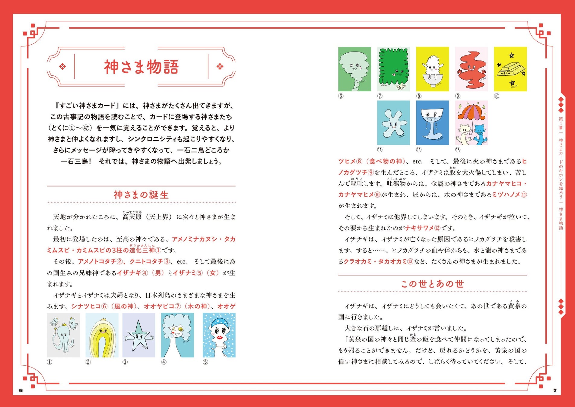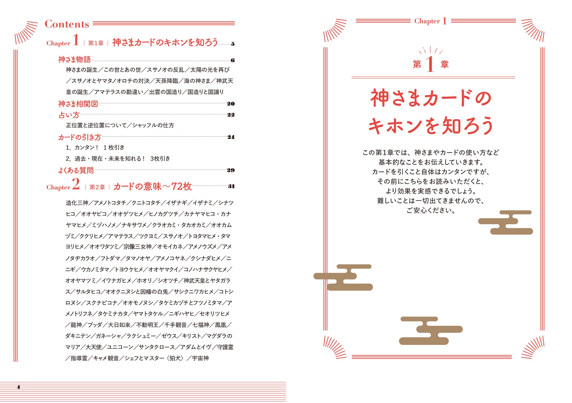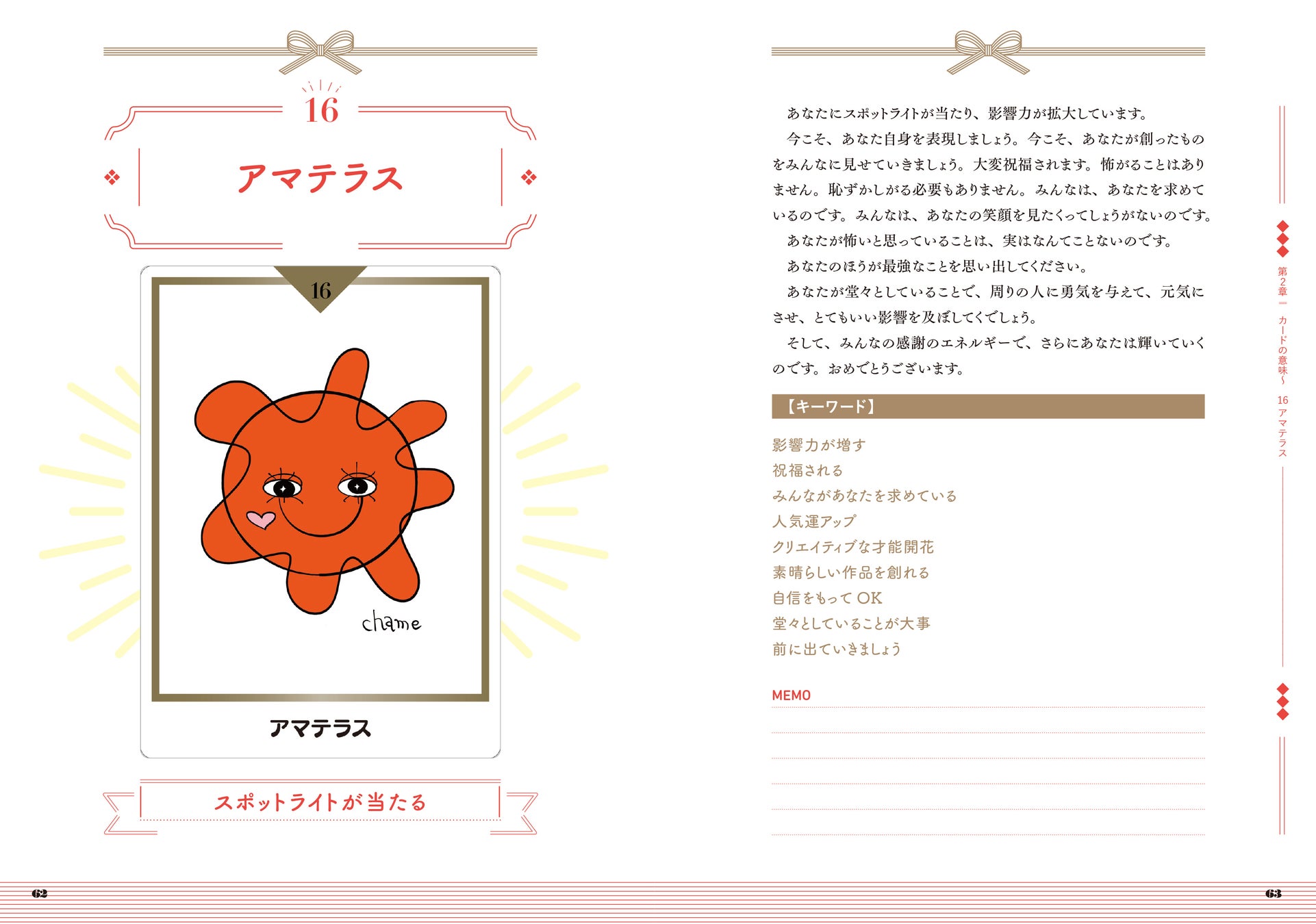 神話の神さまに加え、⿓神、お釈迦さま、⼤⽇如来、不動明王、千⼿観⾳、七福神、鳳凰、ダキニテン、ガネーシャ、ラクシュミー、ゼウス、キリスト、マグダラのマリア、⼤天使、ユニコーン、守護霊、指導霊、キャメ観⾳、うちの狛⽝、宇宙神など、みんなが知っている神さまがワイワイてんこ盛りとなっています。