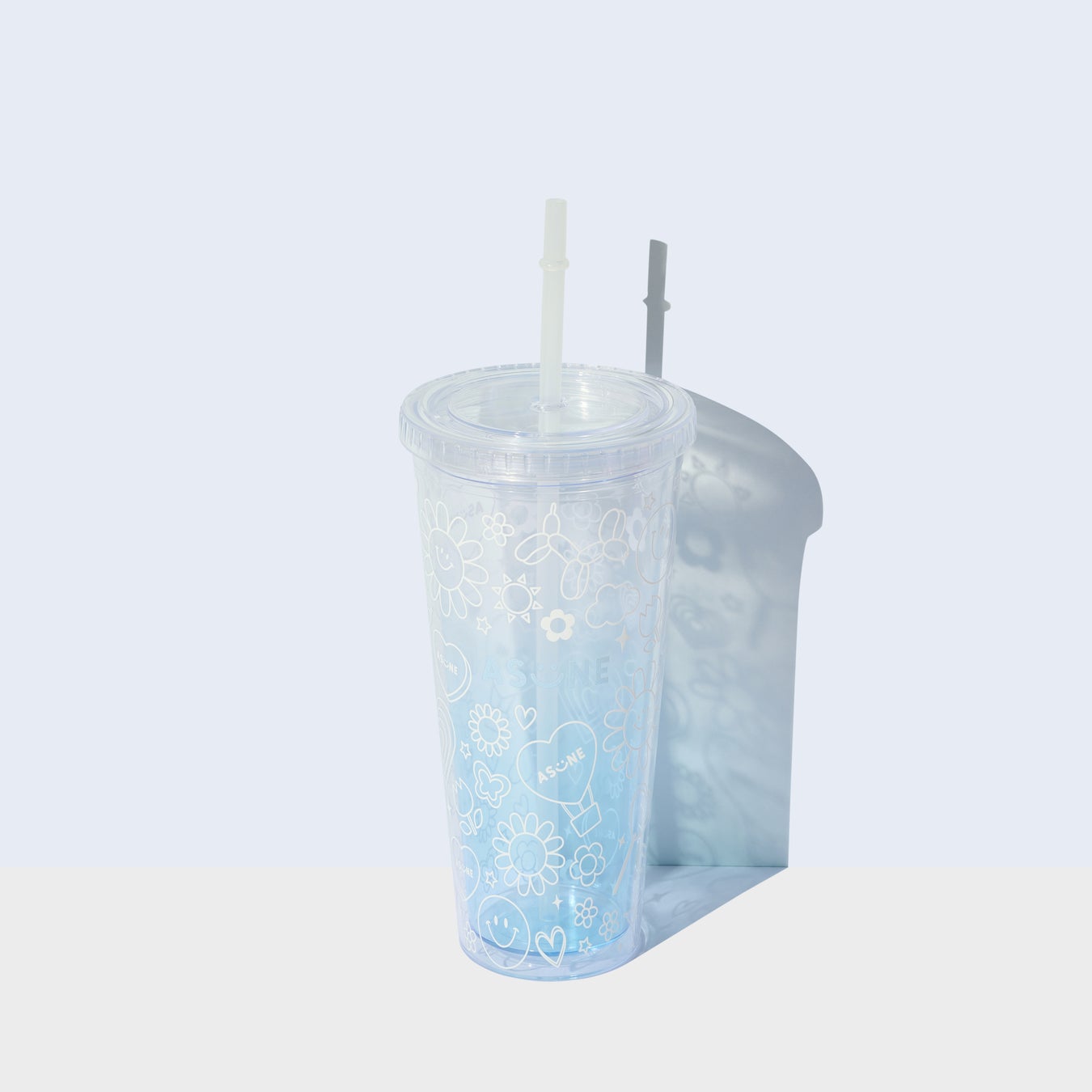 ASUNEの世界観をイメージしイラストを散りばめた、ブルーのグラデーションのASUNE2周年限定タンブラー。650ml入る大容量でストロー付き。