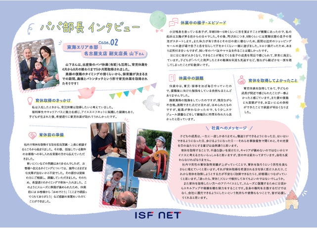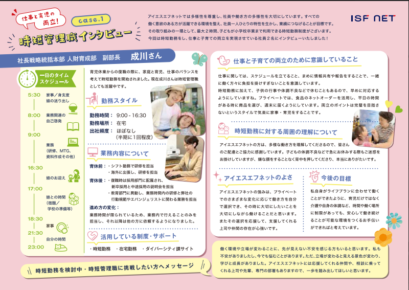 また上記制度の周知や理解を深めるため、子育てのために時短勤務を行っている管理職や育児休業を取得した男性従業員へインタビューし、その記事を社内で展開しています。記事では育児休業中のエピソードや今後の課題、仕事と子育ての両立等についてご紹介し、制度理解や利用の後押しとなっています。