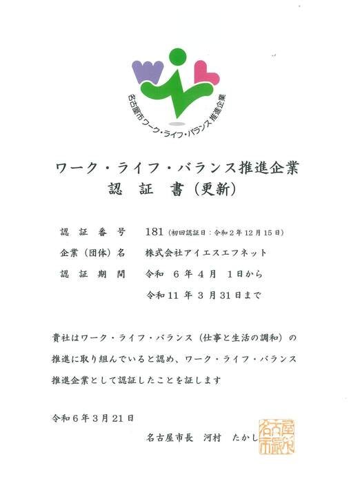 アイエスエフネットが「名古屋市ワーク・ライフ・バランス推進企業認証」にて更新認定いただきました