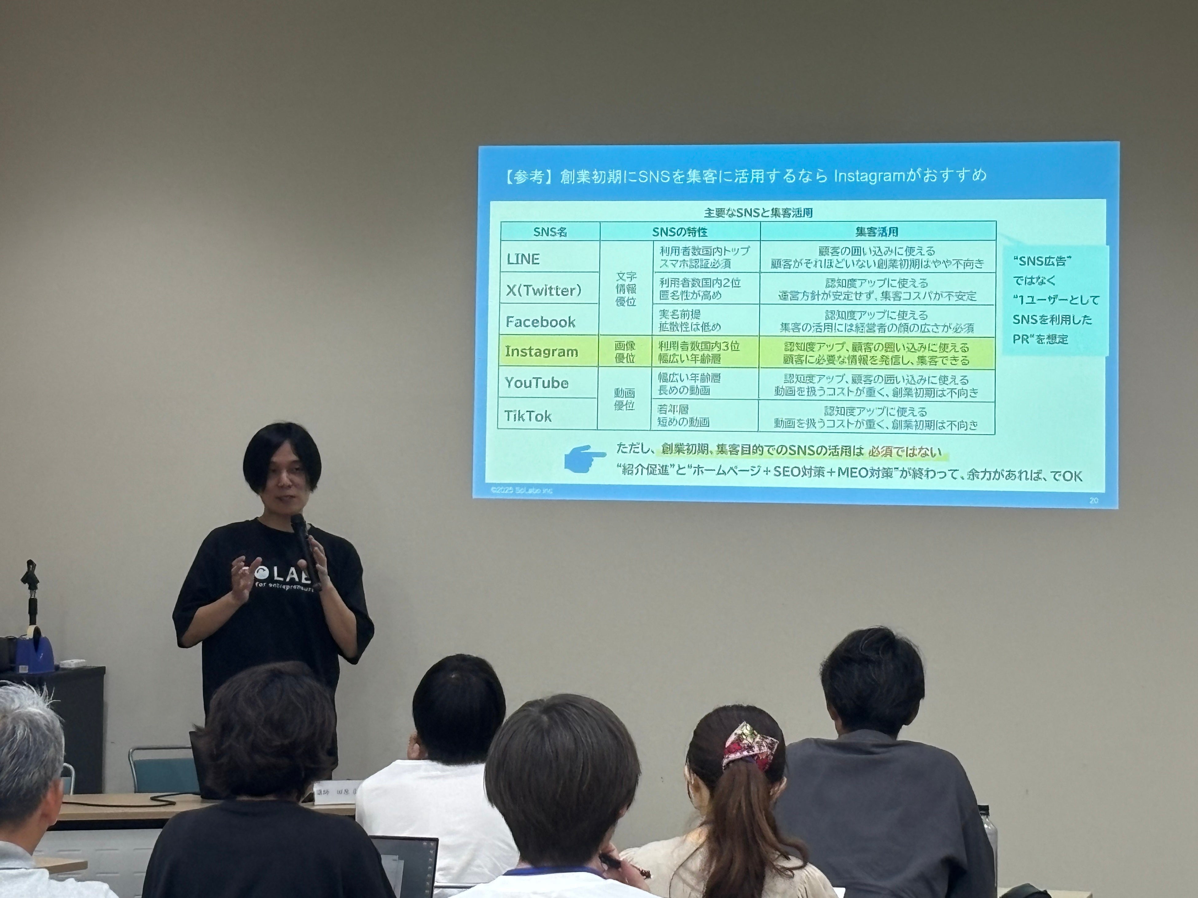 SoLaboは講師として参加し、一般的な創業セミナーで扱われる基礎知識だけでなく、「紹介獲得の仕組み化」「実践的なWeb集客」「小規模組織の人材育成」「資金調達戦略」など、創業者が直面する実務課題に即した内容を提供しました。