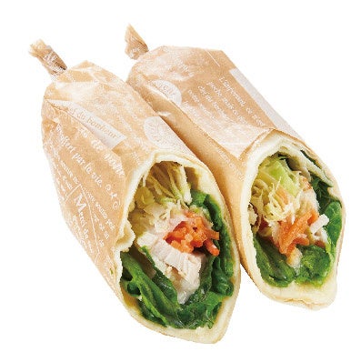 シーザーサラダドレッシングで味付けをした蒸し鶏スライスとキャベツ・グリーンリーフ・キャロットラぺをトルティーヤ生地で巻きました。ボリューム満点なので、一品で大満足のサンドイッチです。