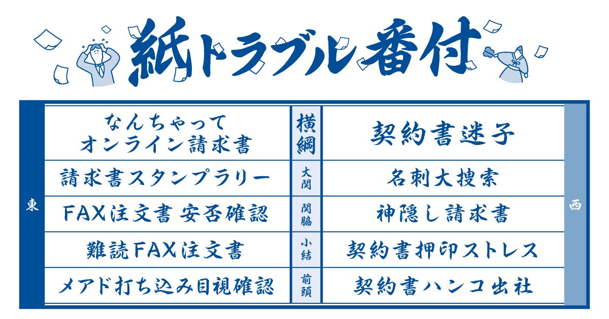 Sansan株式会社、「紙トラブル番付」を発表、横綱は「なんちゃってオンライン請求書」「契約書迷子」
