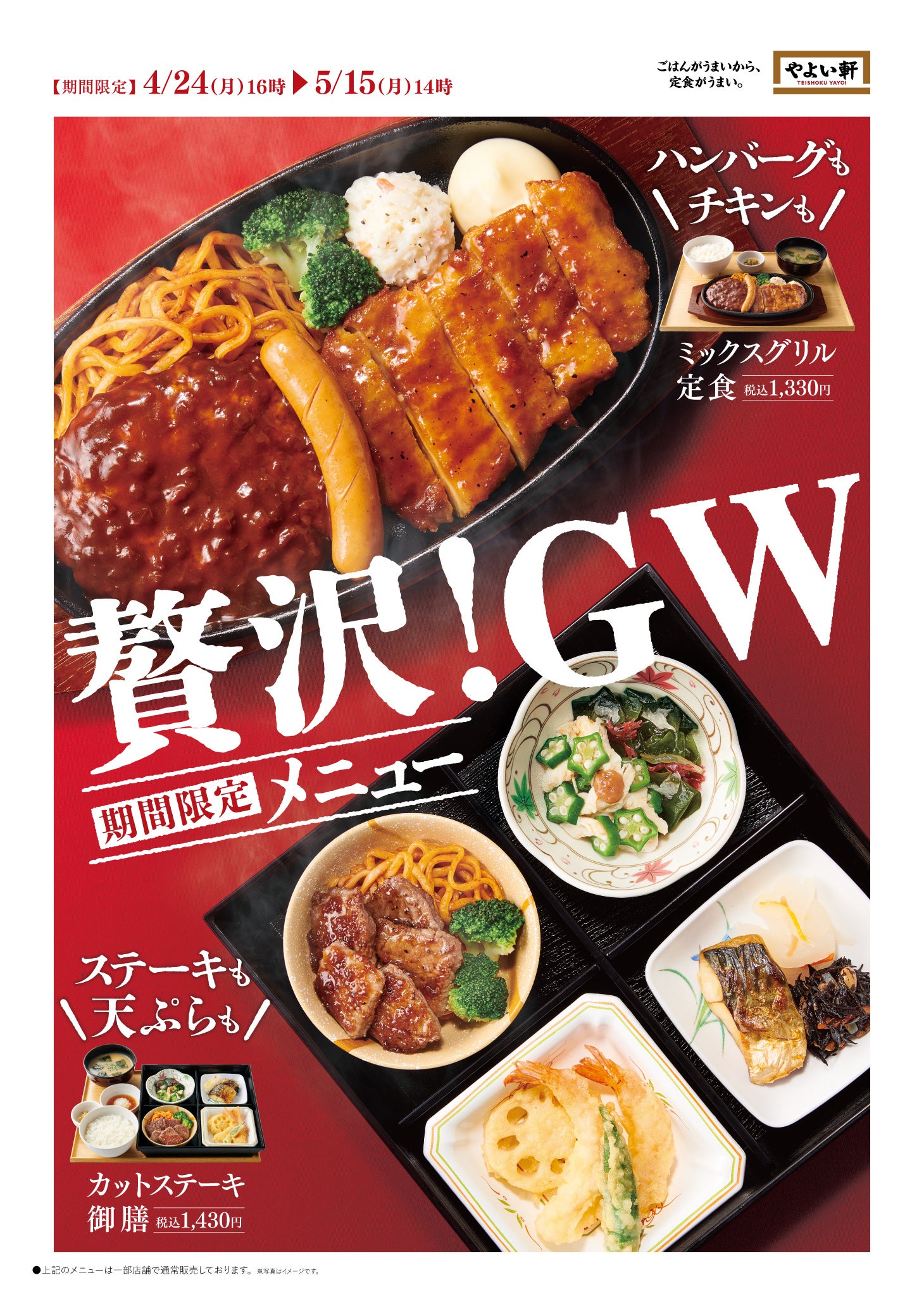 「やよい軒」がっつりグリルも、いろいろなおかずの彩り御膳も!家族みんなで楽しめる“ちょっと贅沢な”GWおすすめメニュー登場「ミックスグリル定食」1,330円「カットステーキ御膳」1,430円