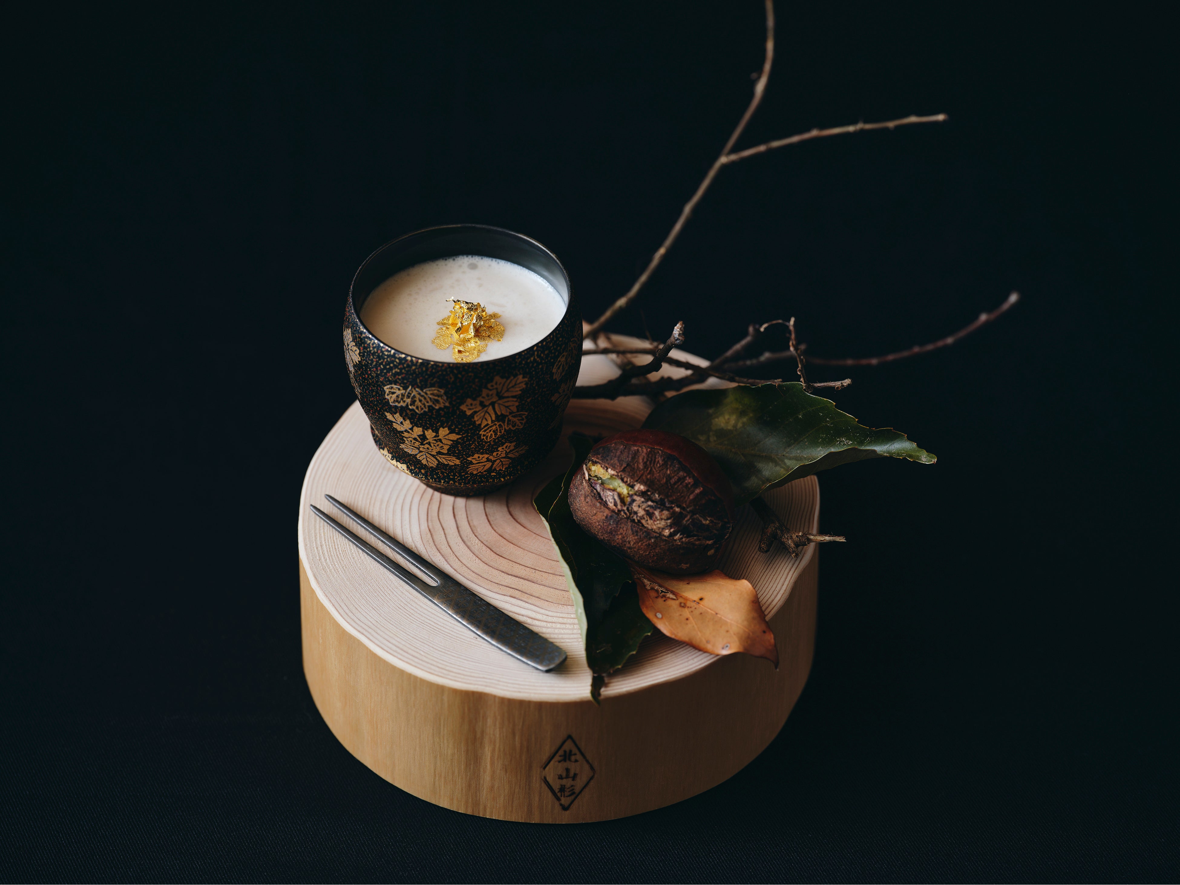 栗の和菓子をイメージした大人のデザートカクテル。焼き栗や 白餡、白味噌をブレンドしたクリームに、マロンリキュールを合わせた一杯です。栗の実を感じる舌ざわりにクリームのコクと甘さが後を引く秋のシーズナルカクテルは、ディナー後のデザートとしてもおすすめです。ホテルのシンボルツリーでもある北山杉でできた特製コースターにのせてご提供いたします。