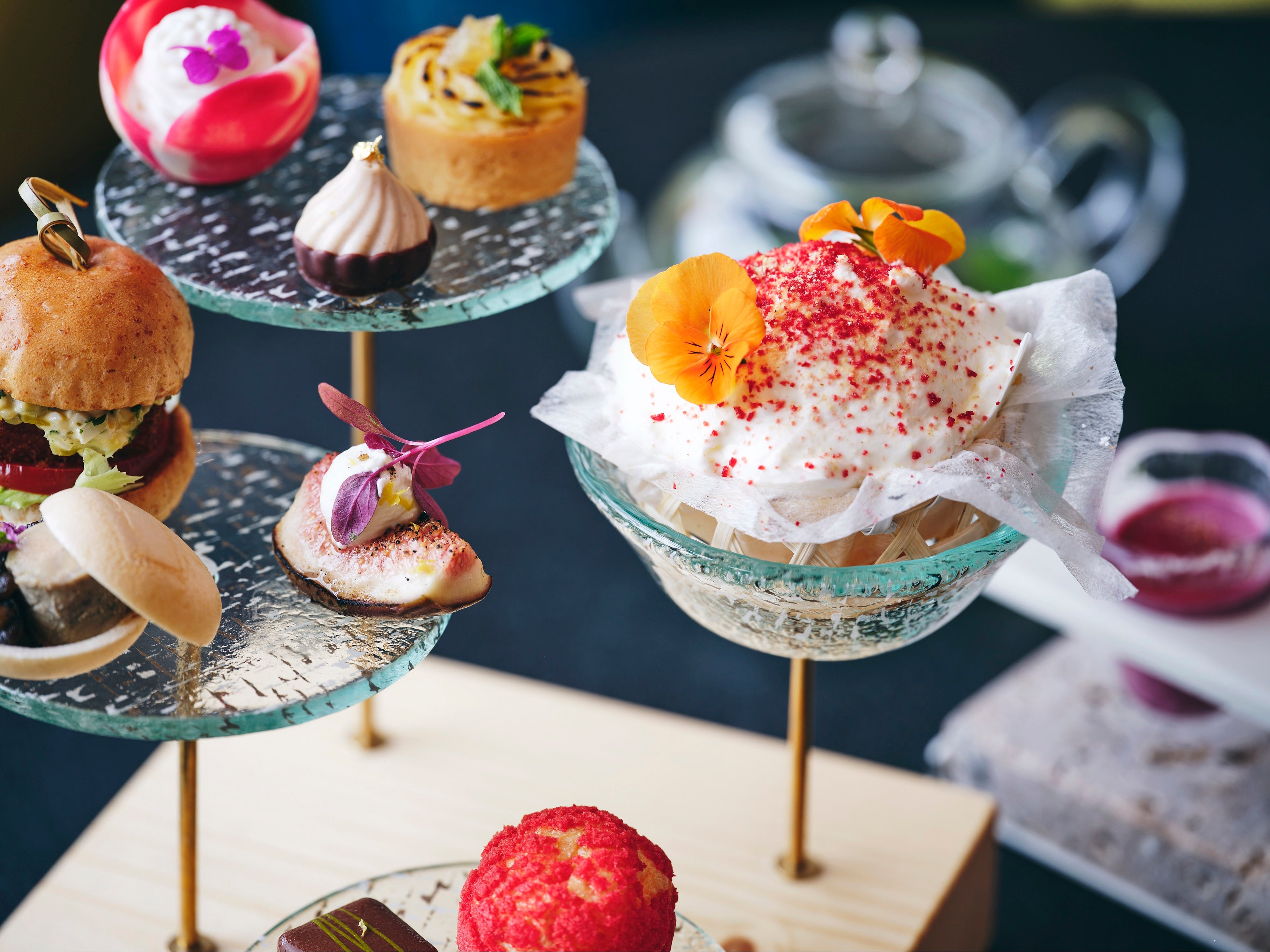 キャラメルと和紅茶のモンブラン、檸檬とさつま芋のタルトといったスイーツの他、秋鮭のコロッケバーガーや無花果とフロマージュブランなど、秋の味覚を堪能するセイボリーを揃えました。中でもシェフ一押しは、黒糖焼酎を浸み込ませたババに刻んだ丹波産黒豆を混ぜ込み、和三盆の優しい甘味で仕上げた自家製わらび餅や軽やかなクレームシャンティを重ねた一品。ホテル敷地内の自社農園でとれたハーブを使ったフレッシュハーブティーを含むオリジナルティーセレクションとともに、豊かな自然に囲まれた空間で優雅な午後のひとときをお過ごしください。