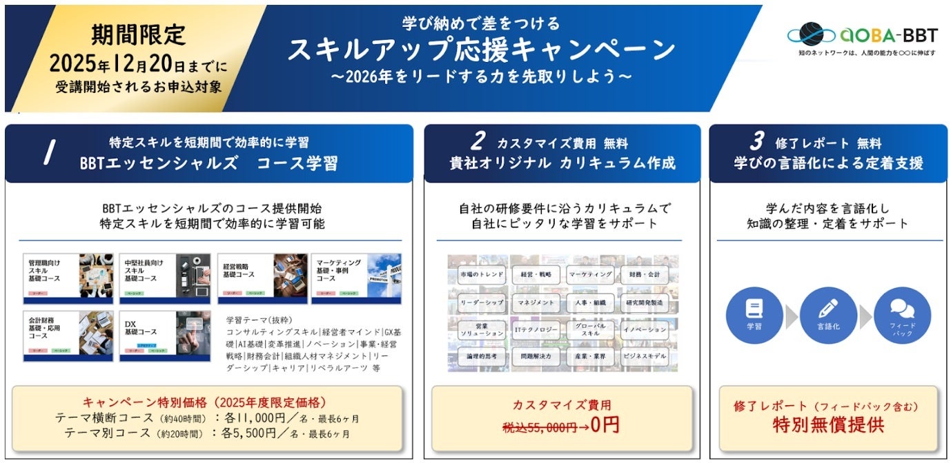 株式会社Aoba-BBT(本社:東京都千代田区、代表取締役社長:柴田巌)は、企業の管理職・中堅社員向け動画学習サービス「BBTエッセンシャルズ」において、冬季限定「スキルアップ応援キャンペーン」を2025年12月20日まで実施します。