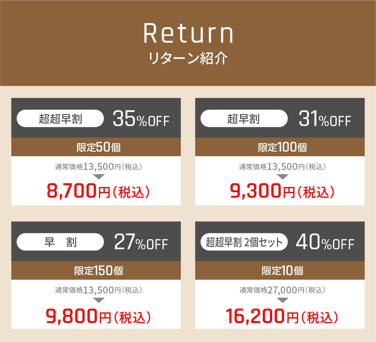 割引率40%の2個セット(10名限定)・35%の超超早割(50名限定)など、Makuake限定のリターンを用意しています。