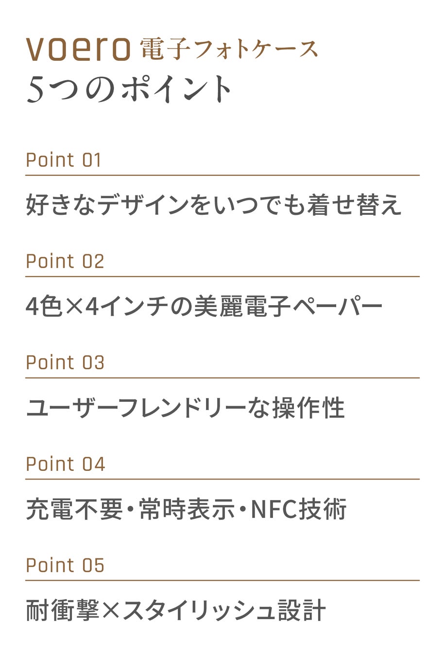 Voeroは画像転送時にスマホのNFC機能を利用し、一度表示した画像は電力ゼロで維持される仕様です。そのため、スマートアクセサリーにありがちな「充電切れで使えない」という心配がありません。