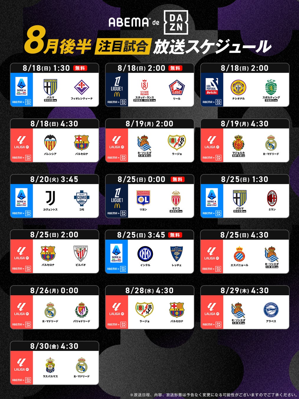 ■「ABEMA de DAZN」 8月注目試合スケジュール 無料対象試合