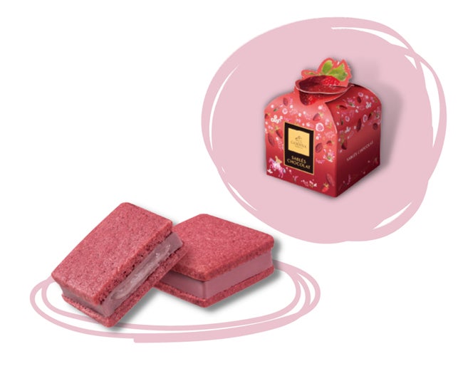 バレンタイン限定の華やかなパッケージに限定フレーバーの「ストロベリー&ルビーチョコレート」を3個詰めました。