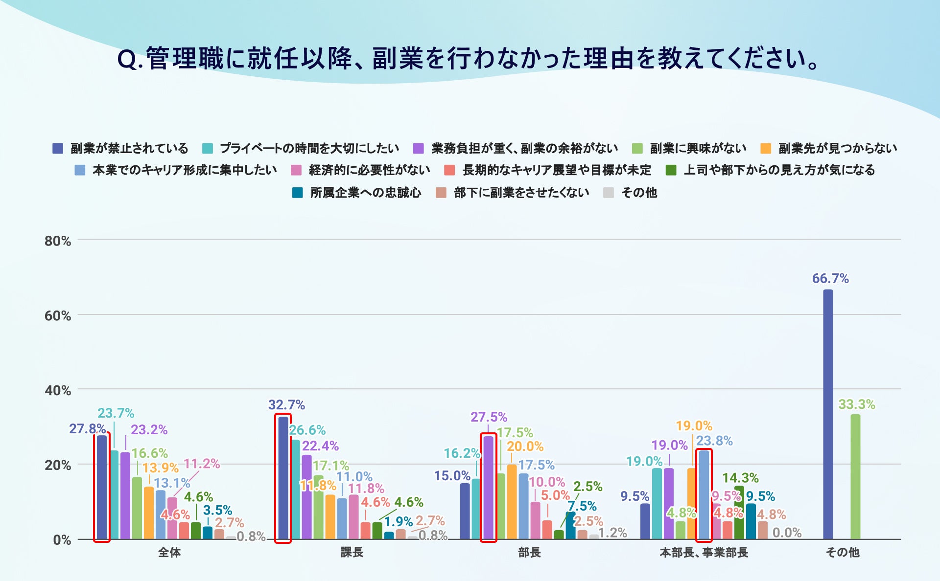 管理職に就任して以降の副業経験がない回答者に、なぜ副業を行わなかったのか尋ねたところ、1位は「副業が禁止されている」(27.8%)、2位は「プライベートの時間を大切にしたい」(23.7%)、3位は「業務負担が重く、副業の余裕がない」(23.2%)となりました。
