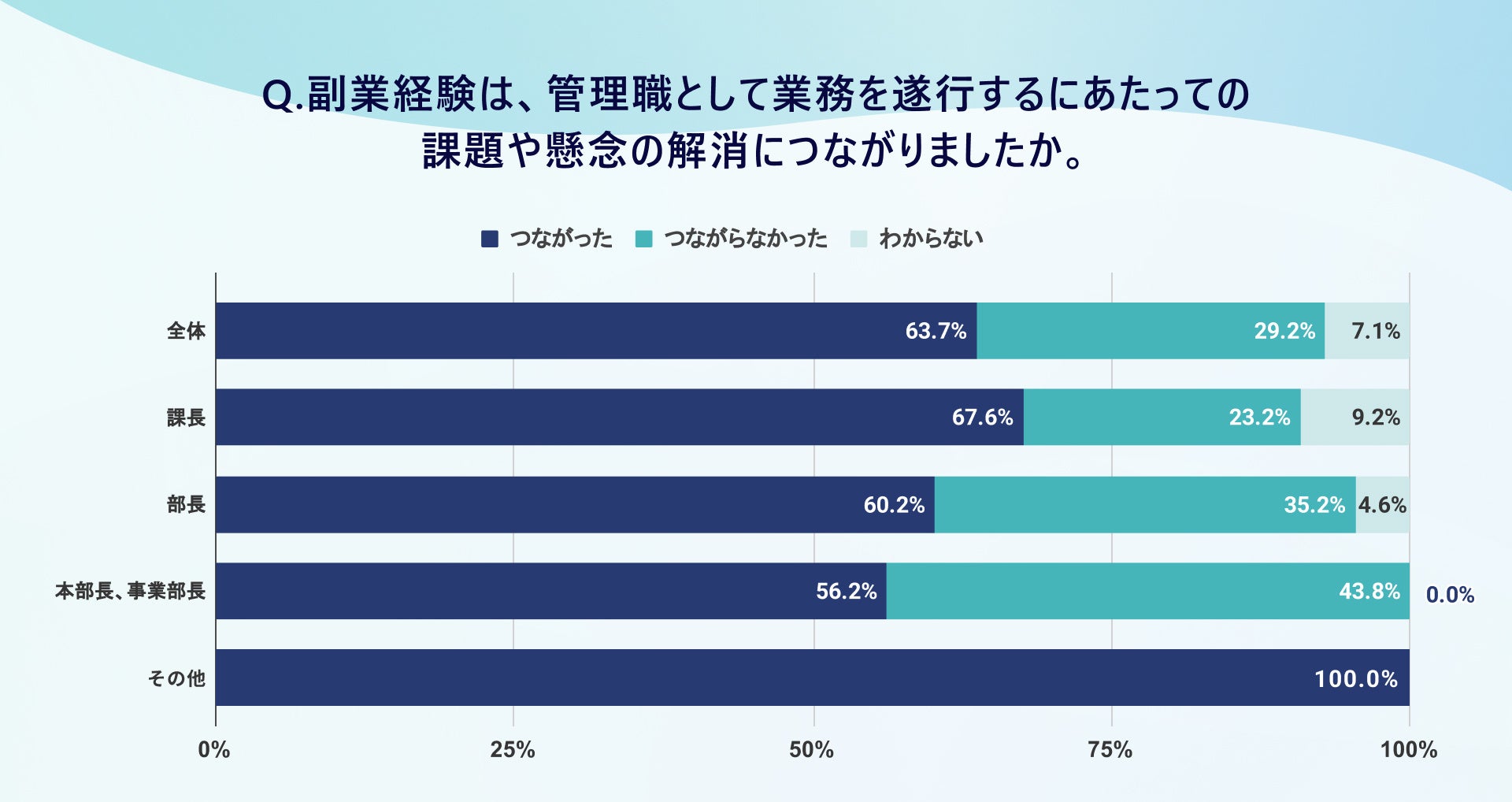 管理職に就任して以降の副業経験がある回答者に、副業をしたことで管理職としての課題や懸念の解消に繋がったかを尋ねたところ、「課題や懸念の解消に繋がった」との回答は63.7%、「繋がらなかった」との回答は29.2%、「わからない」との回答は7.1%となりました。