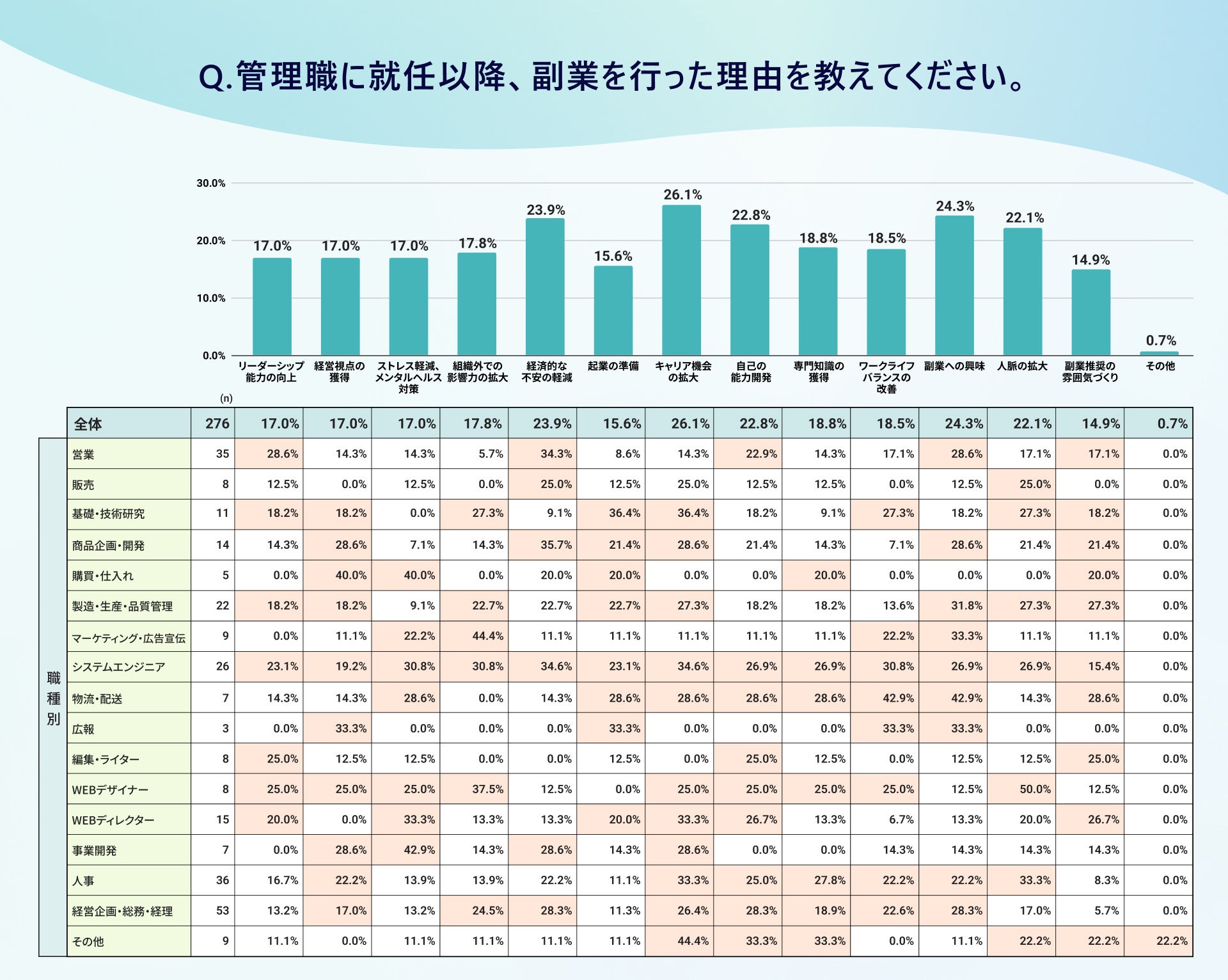 ✓管理職の副業理由1位は「キャリア機会の拡大」、職種により特色が出る結果に