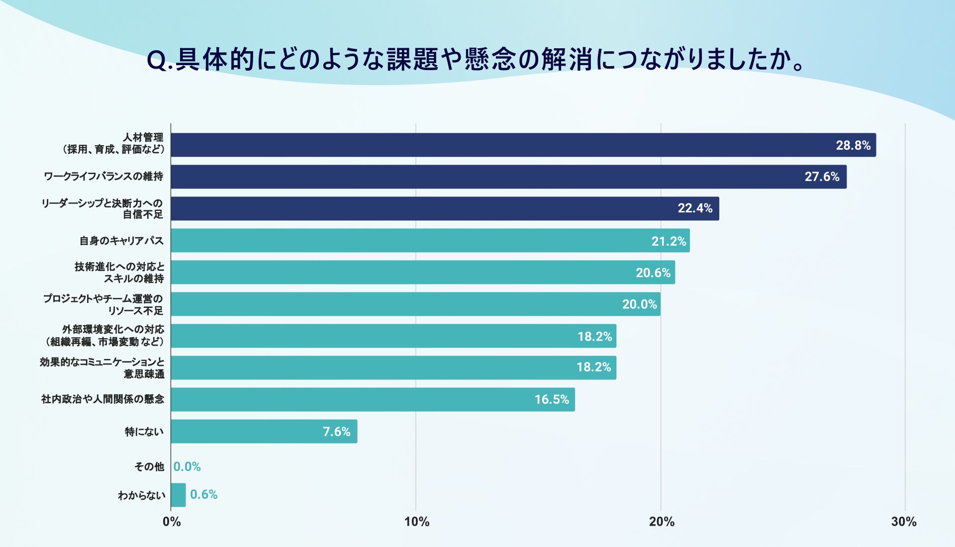 副業が管理職としての課題や懸念の解消に繋がったと答えた回答者に、具体的にどのような解消に繋がったのかを尋ねたところ、1位は「人材管理(採用・育成・評価)」(28.8%)、2位は「ワークライフバランスの維持」(27.6%)、3位は「リーダーシップと決断力への自信不足」(22.4%)となりました。