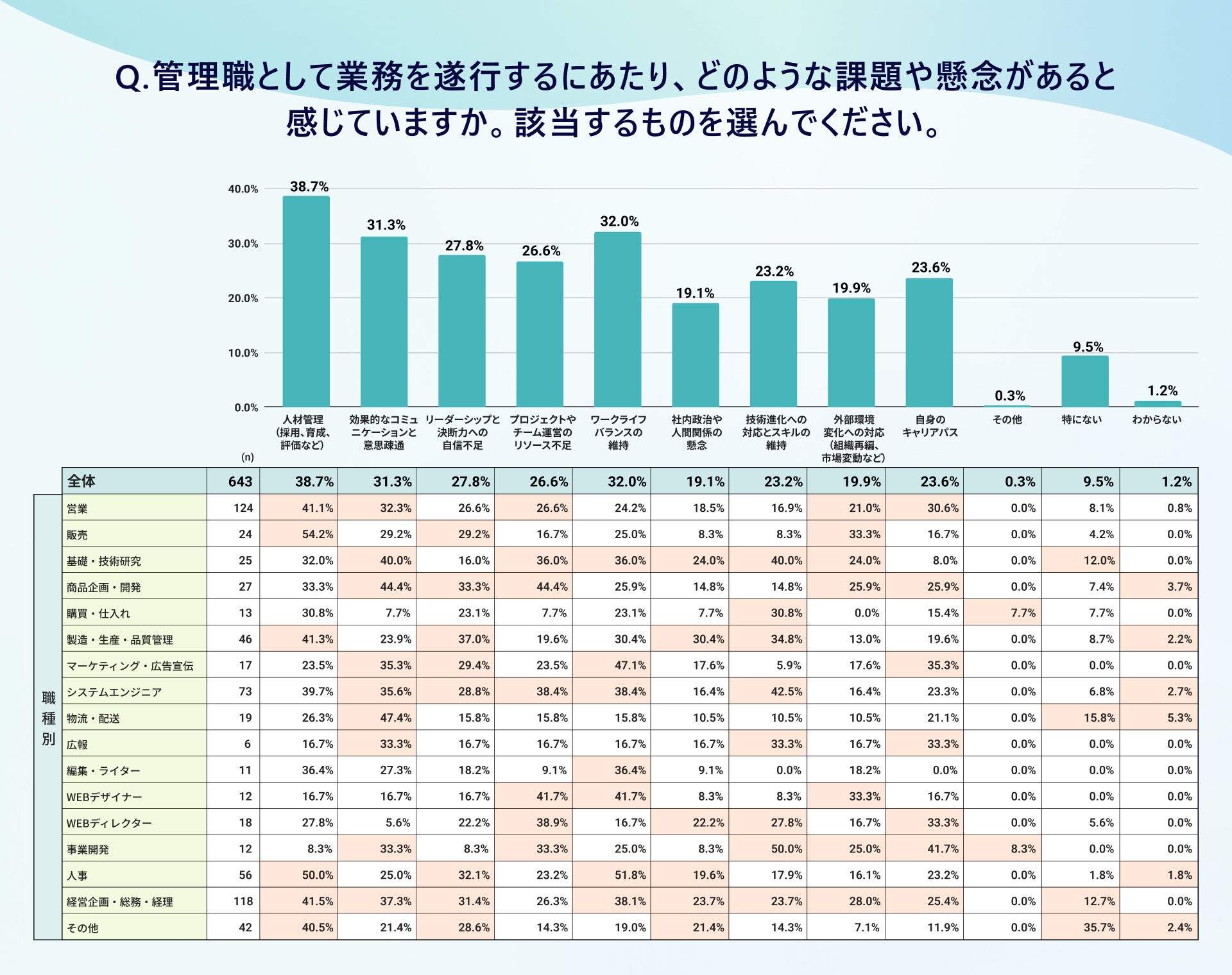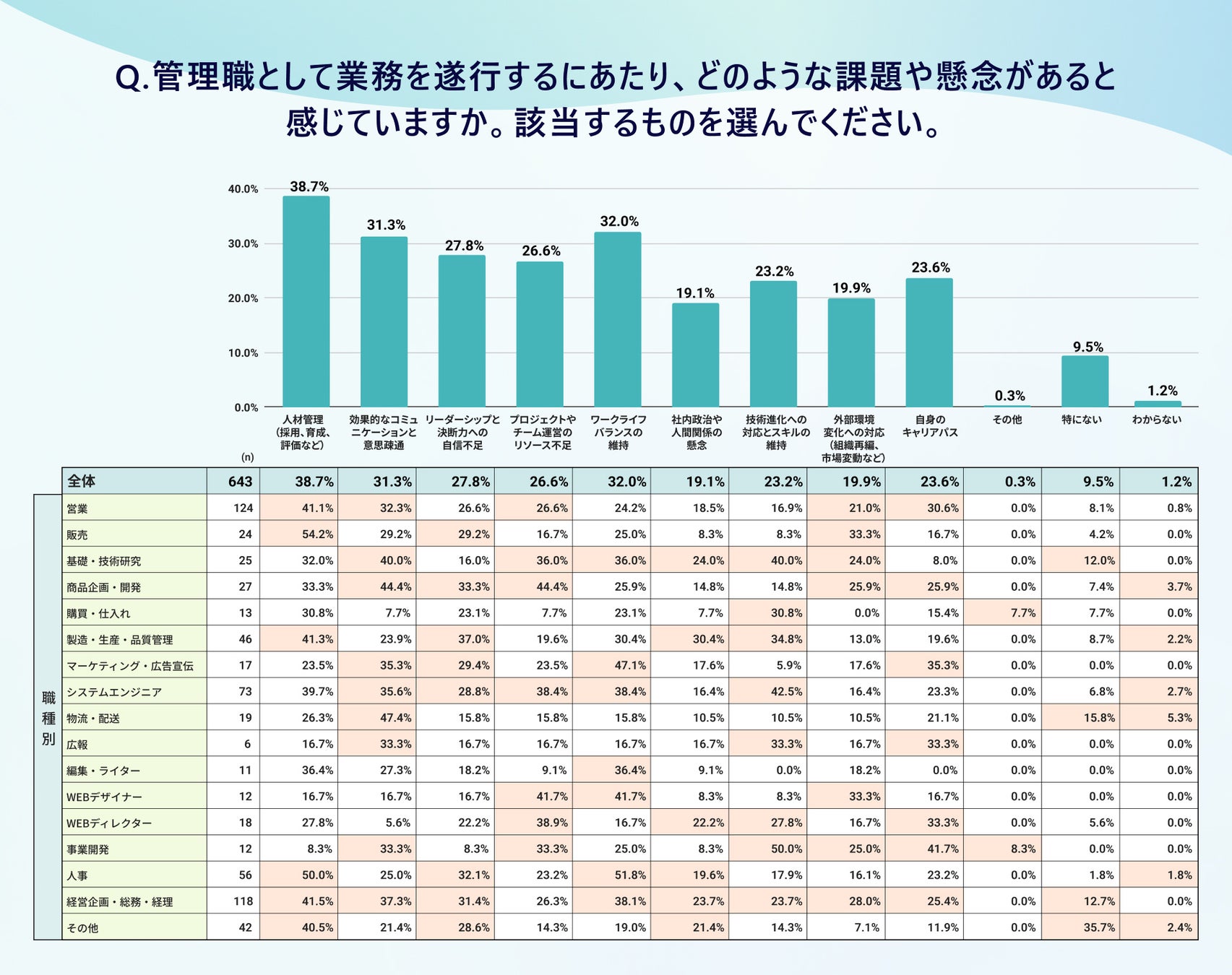 ✓管理職の不安要素トップは「人材管理」、職種別でさまざまな傾向