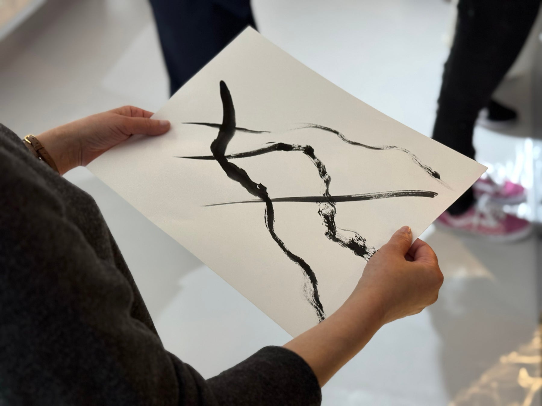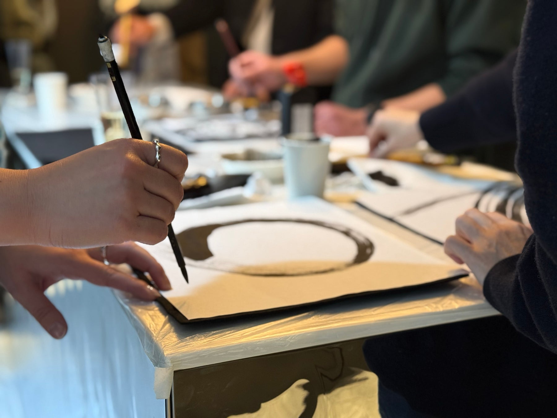 後半は、参加者自身が実際に筆をとって曲線を描くワークショップを開催しました。自由な発想で墨を使い、思い思いの“線”を表現する体験を通して、作品鑑賞とは異なる形で墨の魅力とアーティストの視点に触れることのできる機会となりました。