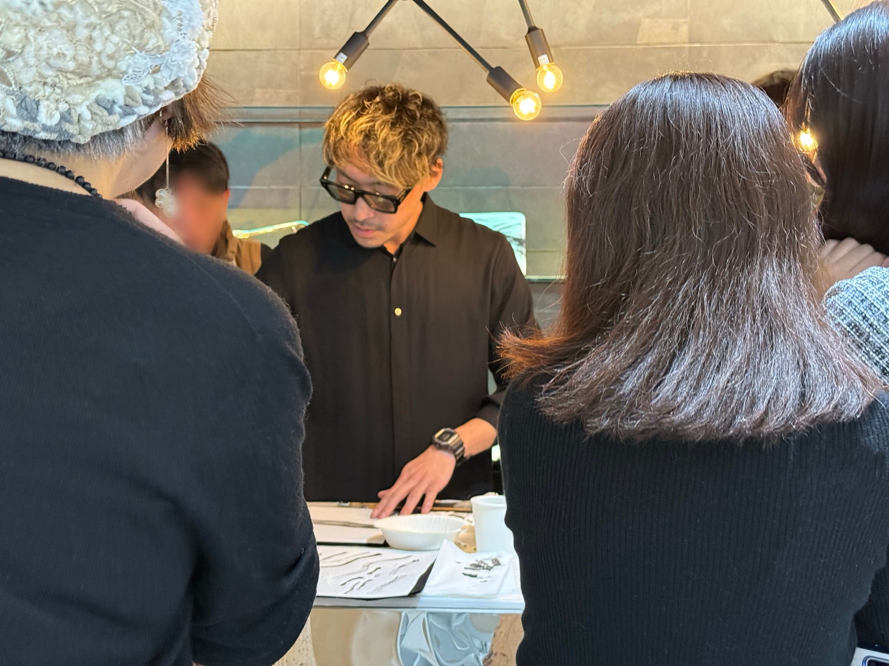 クロージングパーティーには事前予約のうえご参加いただいた20名のアートファンが集い、アーティストとの貴重な時間を共有しました。前半では、西元祐貴が自身の作品について語るとともに、墨による“曲線の描き方”を実際に披露するデモンストレーションを行い、筆致の美しさと表現力で参加者を魅了しました。参加者は線が生まれる瞬間に立ち会いながら、一筆一筆に息をのむように見入っており、その世界観に深く引き込まれていました。