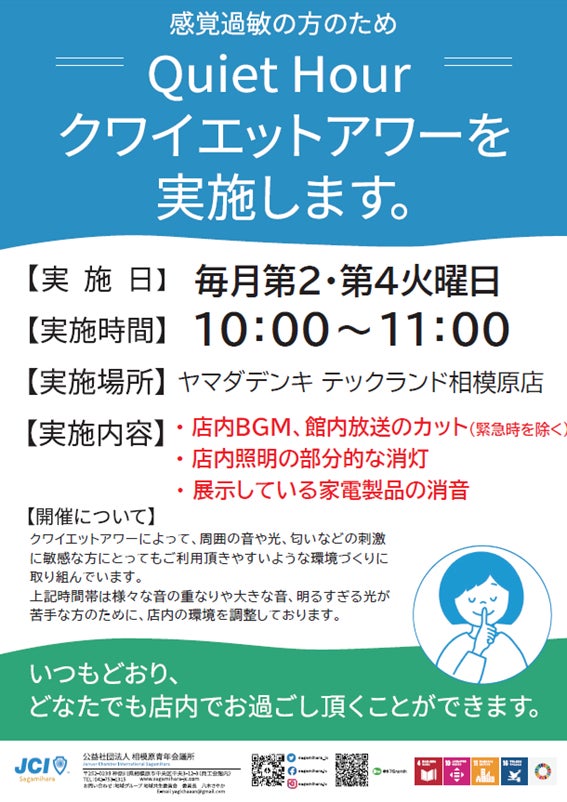 2023年3月、公益社団法人 相模原青年会議所と連携し、ヤマダデンキ店舗において初の試みとして実施、感覚過敏の方とそのご家族がご利用いただきやすいお時間となるよう、一時的に店内の照明やBGMをカットする等、店内の光や音を調整しました。