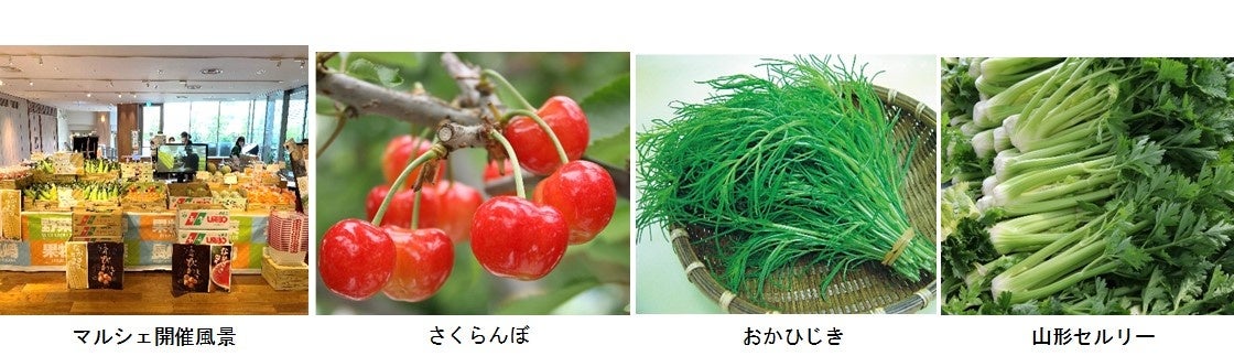 今回のマルシェでは、園芸大国である山形から全国生産量の約75%を占めるさくらんぼを始め、山形セルリー、おかひじき、アスパラガスなどの新鮮な旬の野菜、「つや姫」や「雪若丸」、「山形代表ジュース」、山形牛カレーなどの山形県の特産品を取り揃えて販売します。