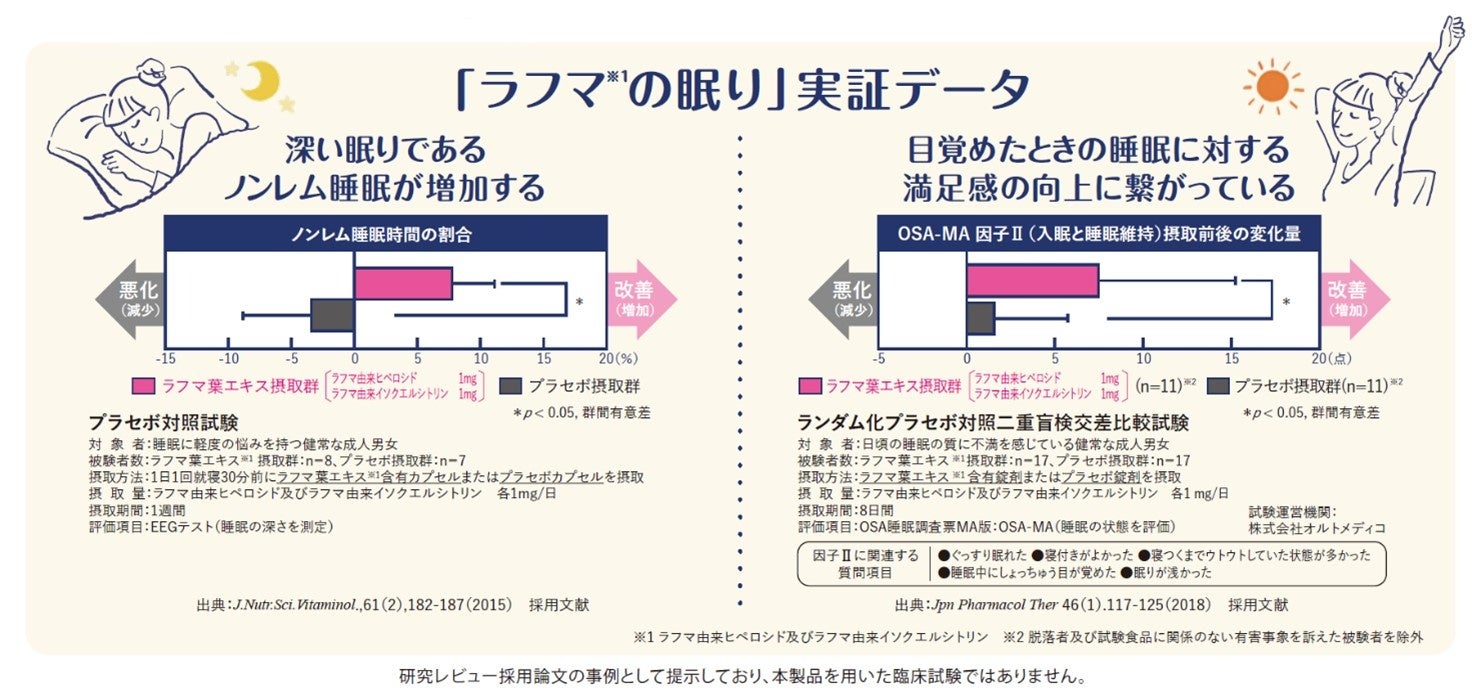 本品にはラフマ由来ヒペロシド、ラフマ由来イソクエルシトリンが含まれます。ラフマ由来ヒペロシド、ラフマ由来イソクエルシトリンには睡眠の質(眠りの深さ・起床時の睡眠に対する満足感)の向上に役立つことが報告されています。