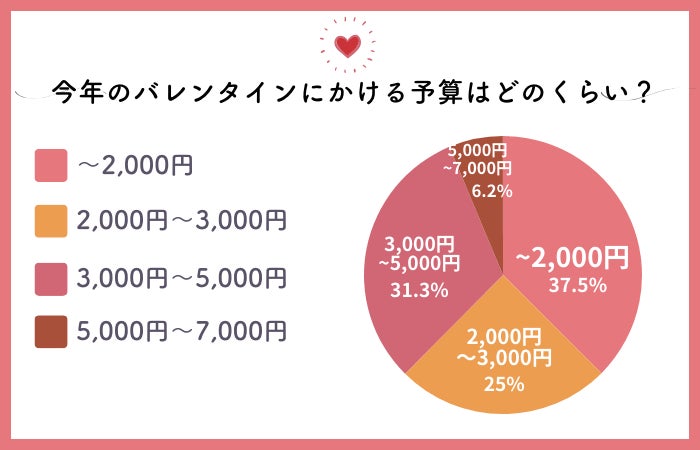3.で「購入する」と答えた人を対象に、「購入するチョコレートの予算」を質問したところ、「〜2,000円」と「3,000円〜5,000円」が30%を超えました。