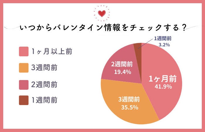 「いつからバレンタインの情報をチェックしますか?」と質問したところ、「1ヶ月以上前」が41.9%、「3週間前」が35.5%となりました。