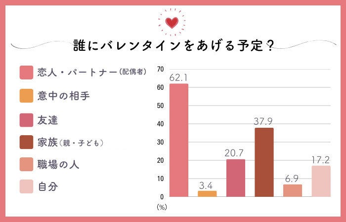 1.で「はい」と答えた人を対象に、チョコレートを渡す相手を質問したところ、「恋人・パートナー(配偶者)」が62.1%となりました。