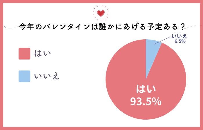 「今年のバレンタインにチョコレートを誰かにプレゼントする予定はありますか?」と質問したところ、「はい」が93.5%となりました。