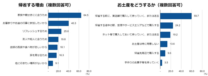 ▪帰省する理由の多くは「家族や親せきに会うため」や「お墓参り」。お土産の購入先は実店舗がほとんど。