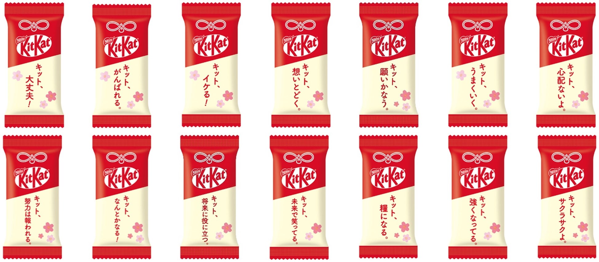 本製品は、定番の赤いパッケージの「ミルクチョコレート」と、「ホワイトチョコレート」の2つの味を1枚で楽しむことができる特別な「キットカット」です。外袋は、縁起が良い紅白カラーに、”願いが叶う”といういわれのある「叶結び」をデザインに取り入れています。また、中の個包装は14種類あり、それぞれ「キット、大丈夫!」などの応援メッセージが書かれており、受験生の応援は勿論、スポーツや恋愛、就職活動などの様々なシーンで、目標に向かって頑張る全ての人を応援するアイテムとしておすすめです。